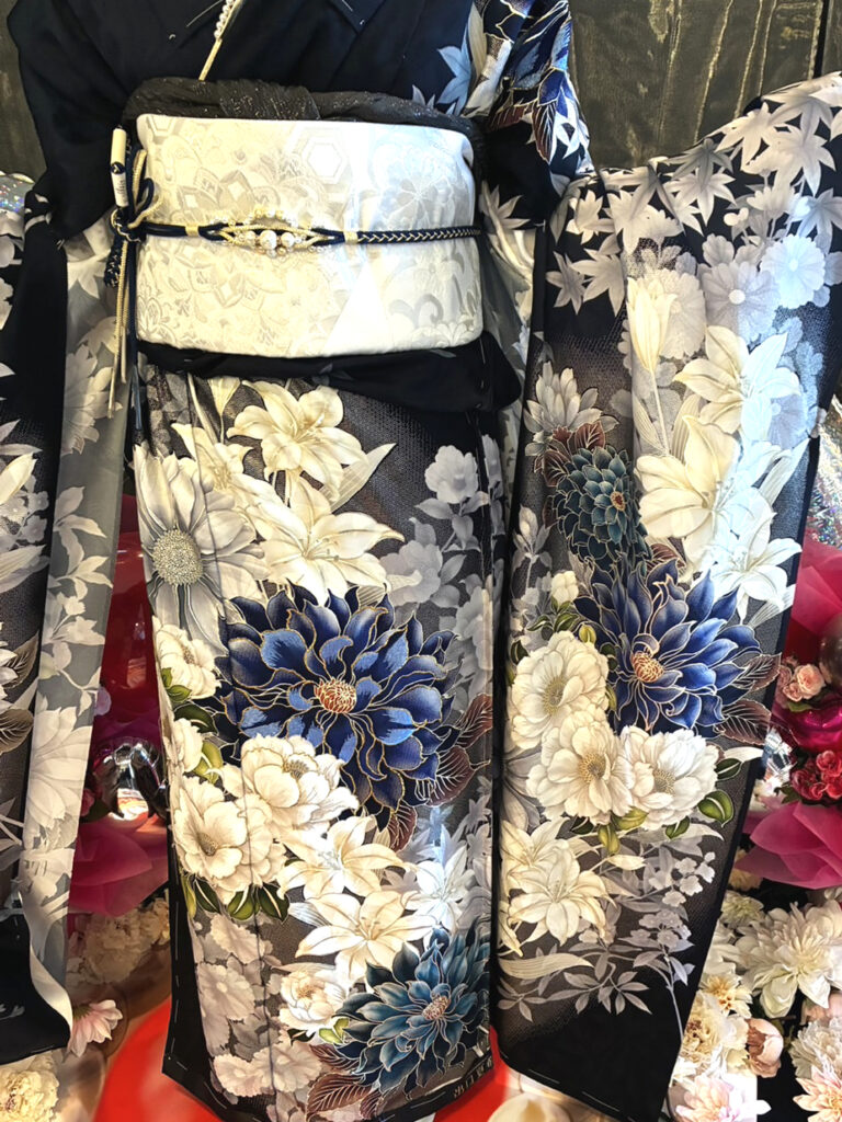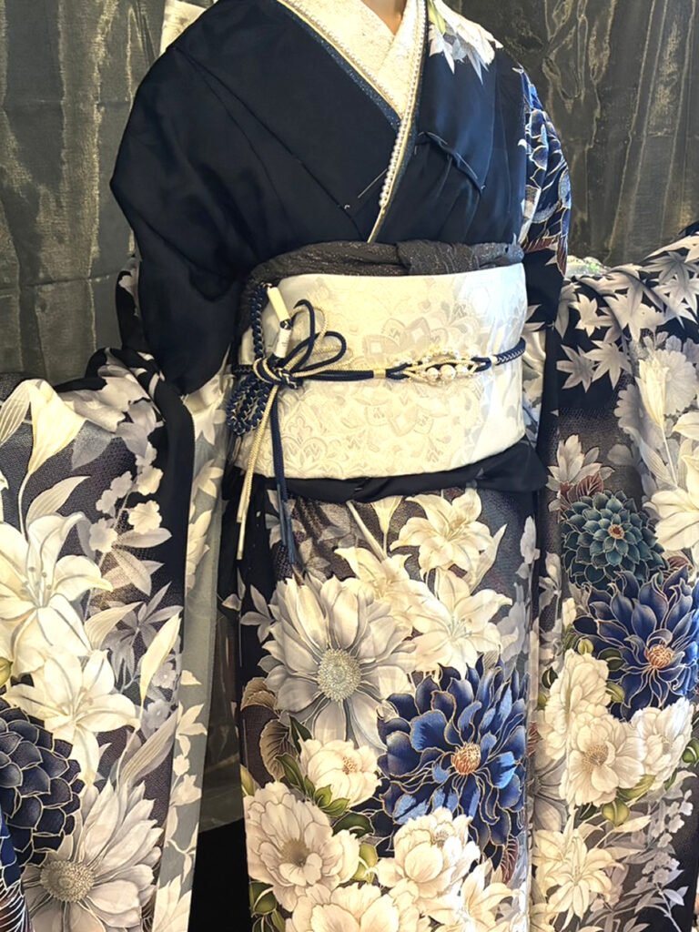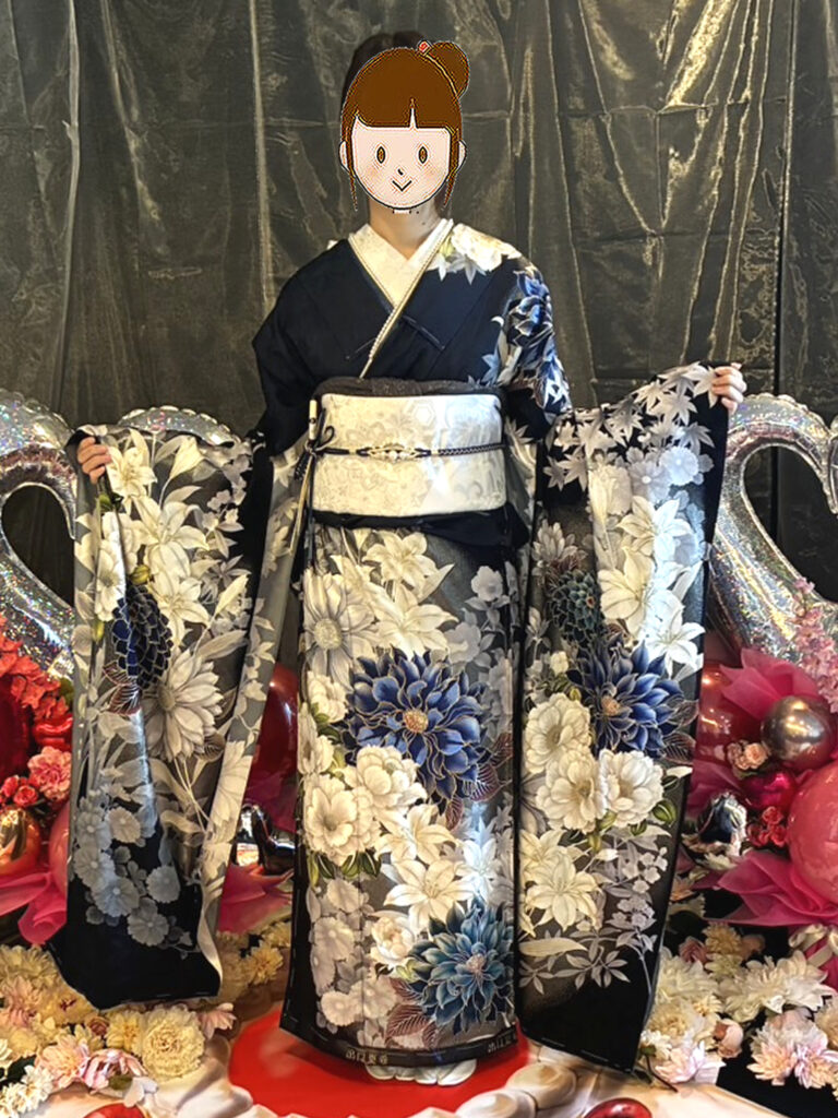 紺の色味が綺麗で柄の華やかなお振袖です。