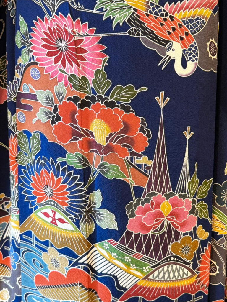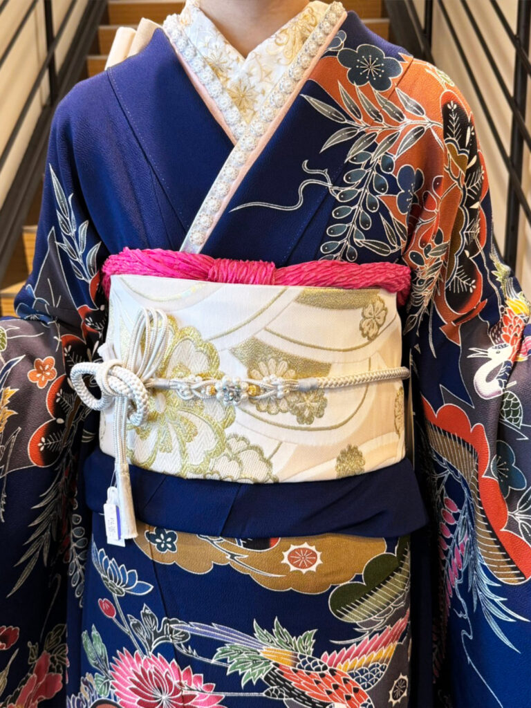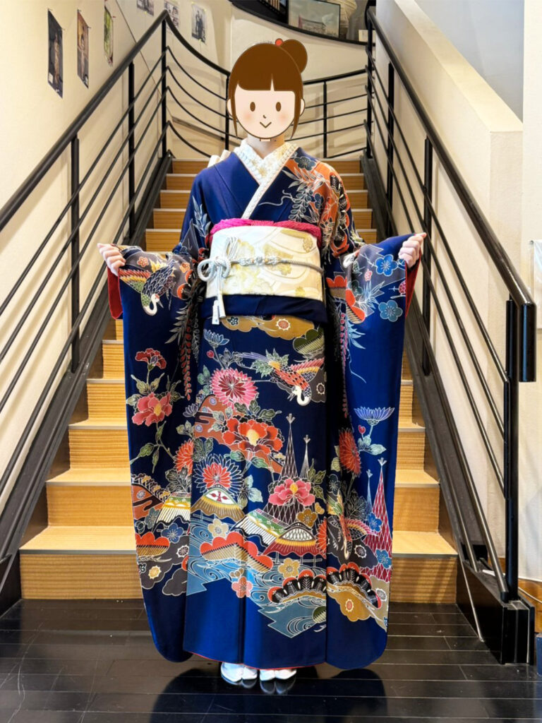 紺地のお振袖に華やかさと若々しさをプラスしました。