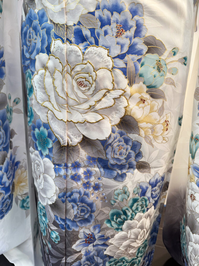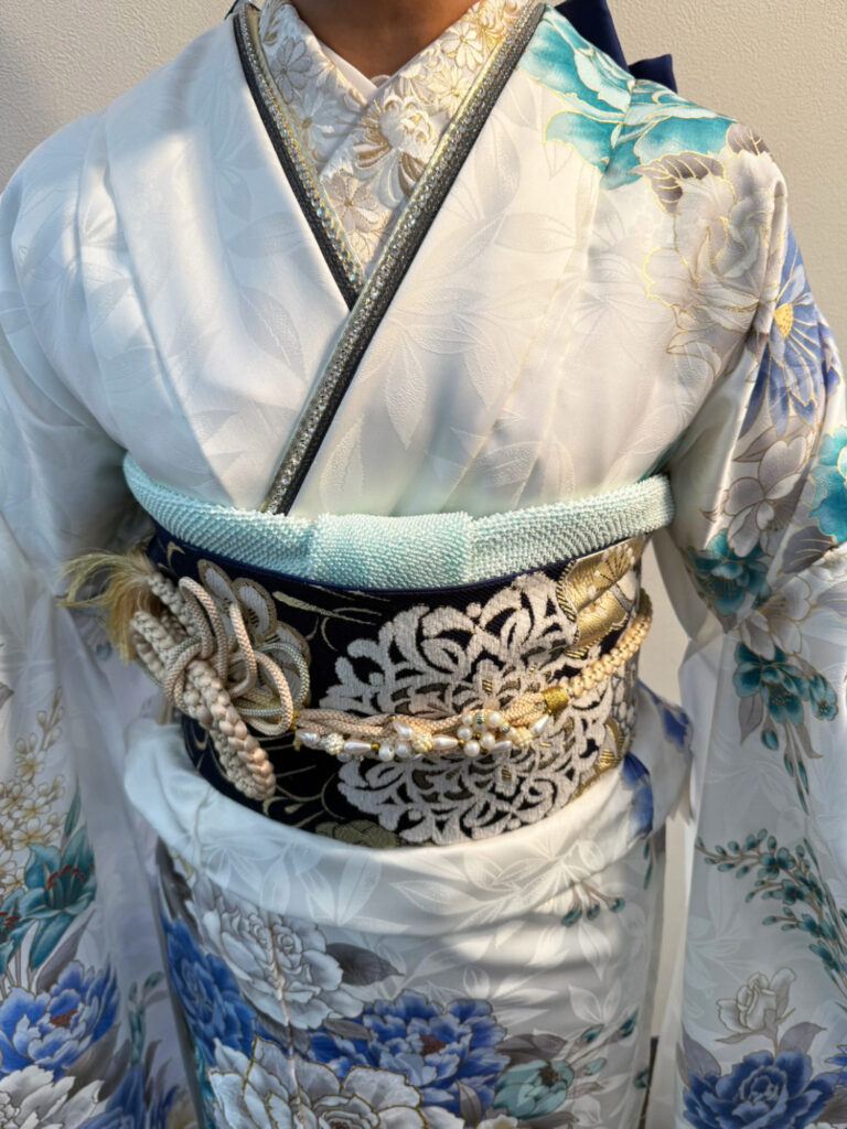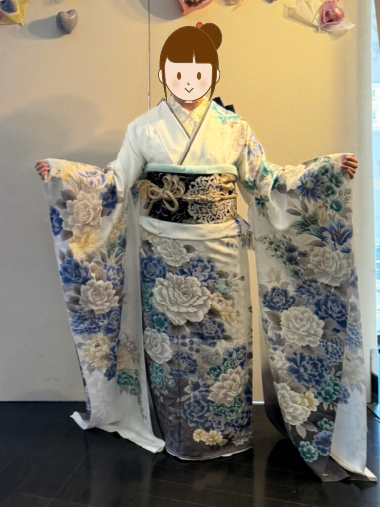 白地に青や淡い色合いの花々が描かれた振袖は、