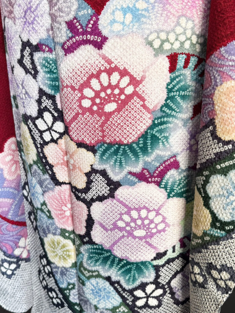 深みのある赤地に、絞りならではの立体感と、