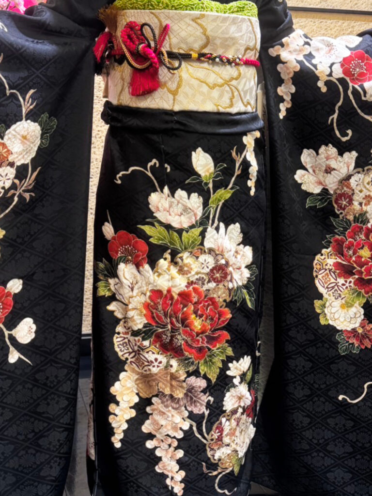 黒地に赤い牡丹が美しく映え、